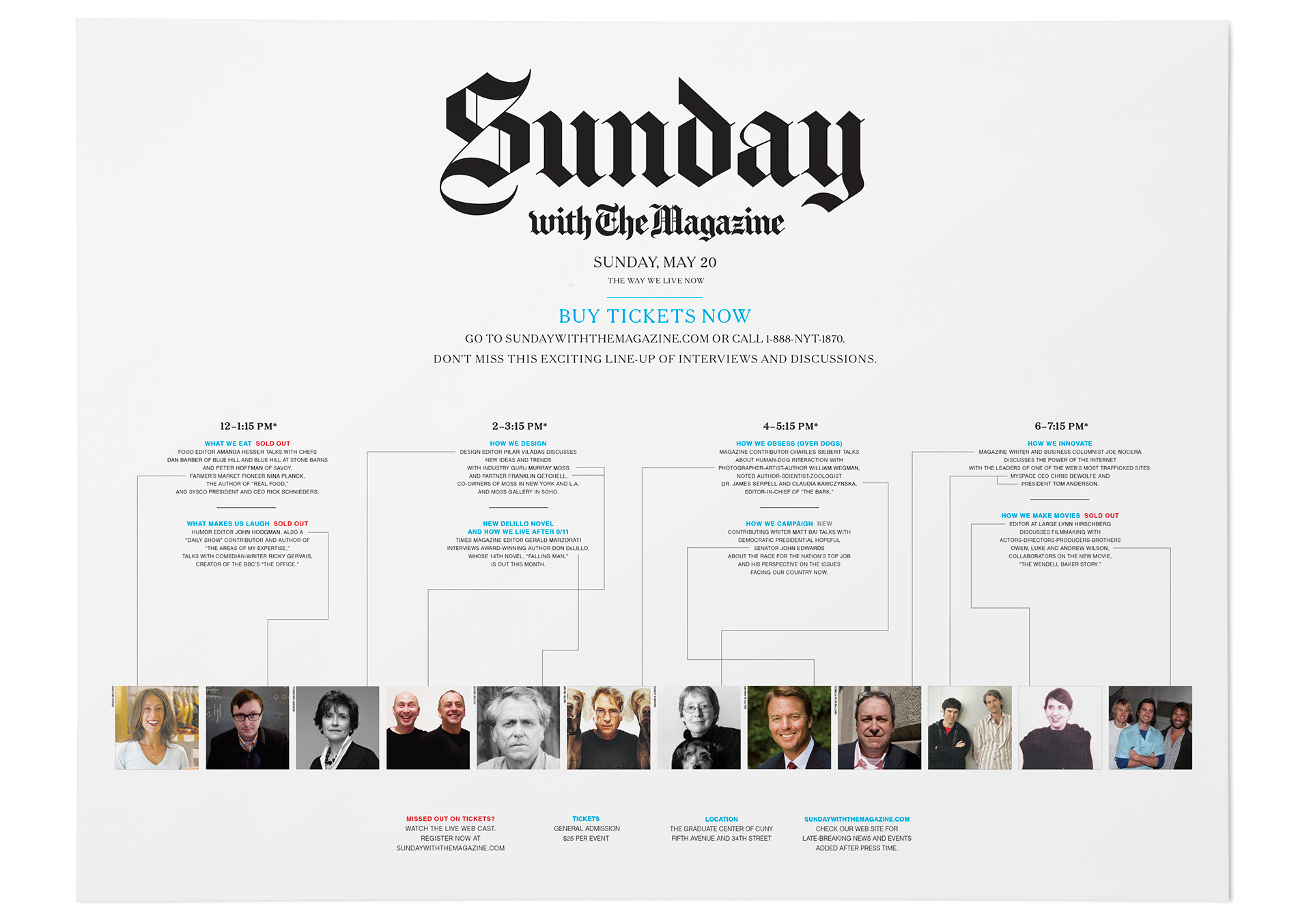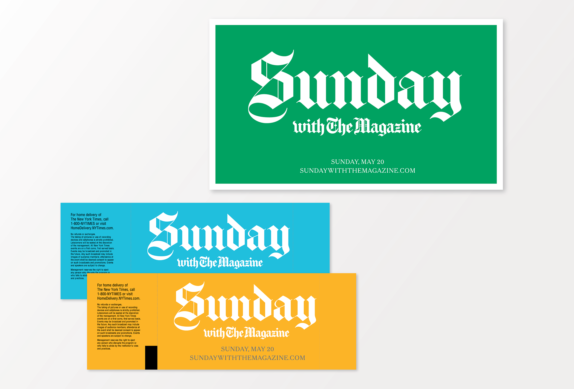 This was a live event that featured editors/writers of The New York Times Magazine and their interviews with celebrities. I branded the name to reflect the identity of the magazine and used different colored chairs to illustrate the diversity of the themed conversations.