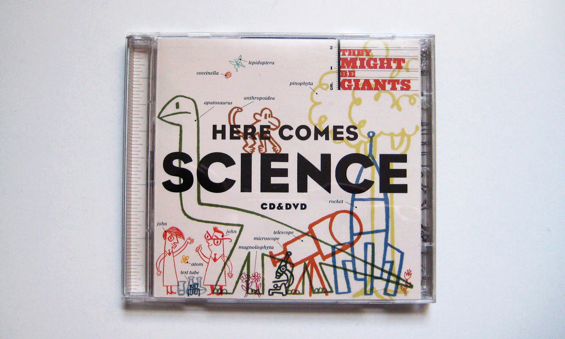 Album packaging for They Might Be Giants featuring songs about science. The enclosed booklet features a timeline of major events in the history of science.