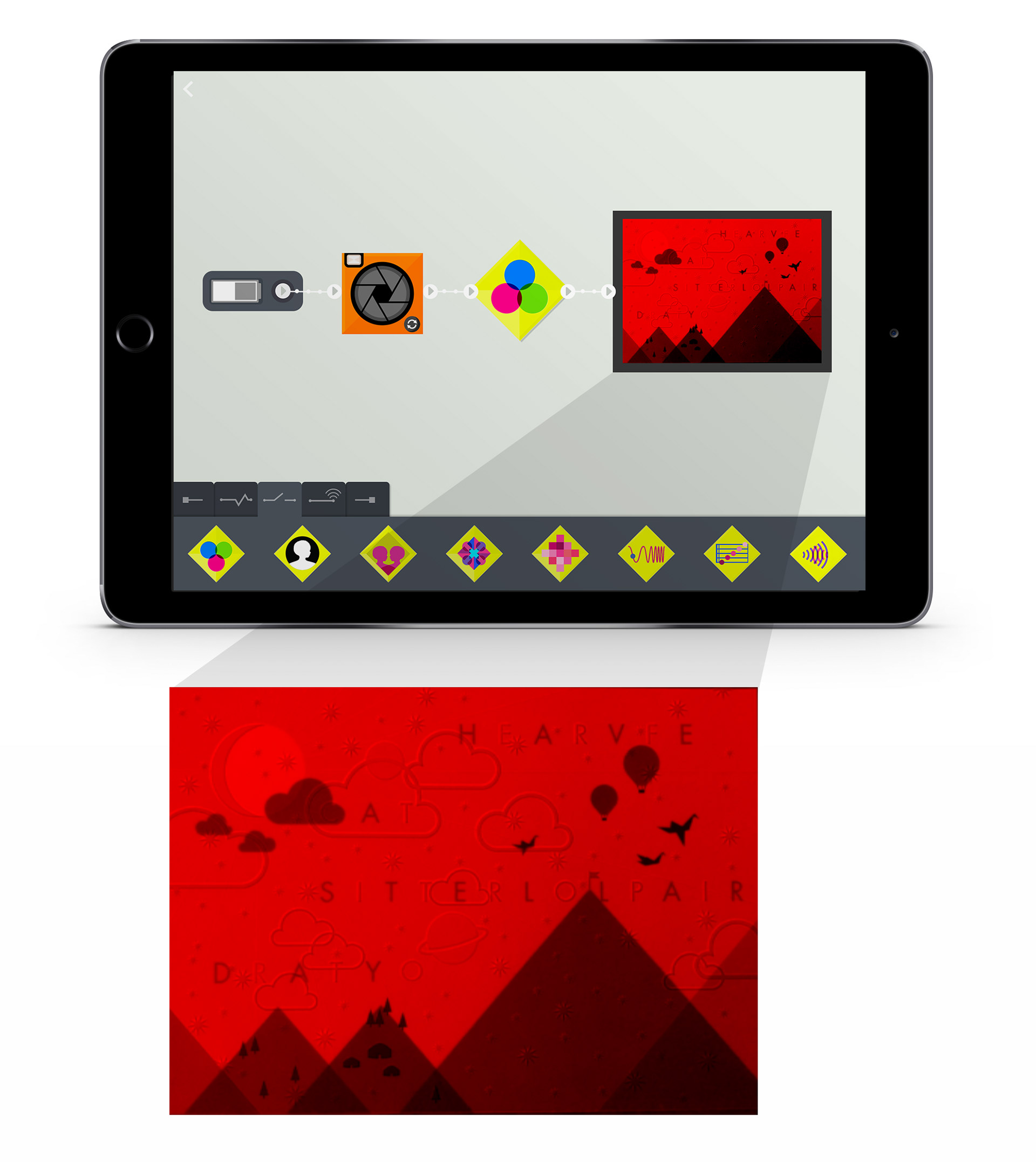 The Everything Machine was illustrated and designed in-house. Designed components in the app visually represent the hardware components of the Apple device, allowing users to make machines based on basic circuitry concepts. Basic categories of parts were designed to represent function: inputs, modifiers, detectors, routers, and outputs. Here is an example of how to build a machine that can decode a hidden message on a postcard by using a red color filter on the phone’s camera.